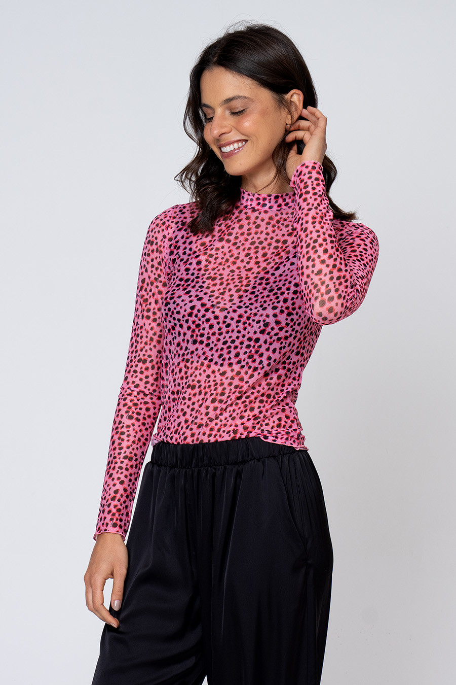 Nesta blusa preta de tule flex, a estética da coleção aparece de forma mais sutil, valorizando a transparência elegante e o visual moderno. O tecido leve e flexível proporciona conforto e caimento delicado, perfeito para sobreposições que destacam a silhueta com sofisticação. Uma peça versátil e contemporânea, ideal para compor looks cheios de atitude sem abrir mão da leveza.