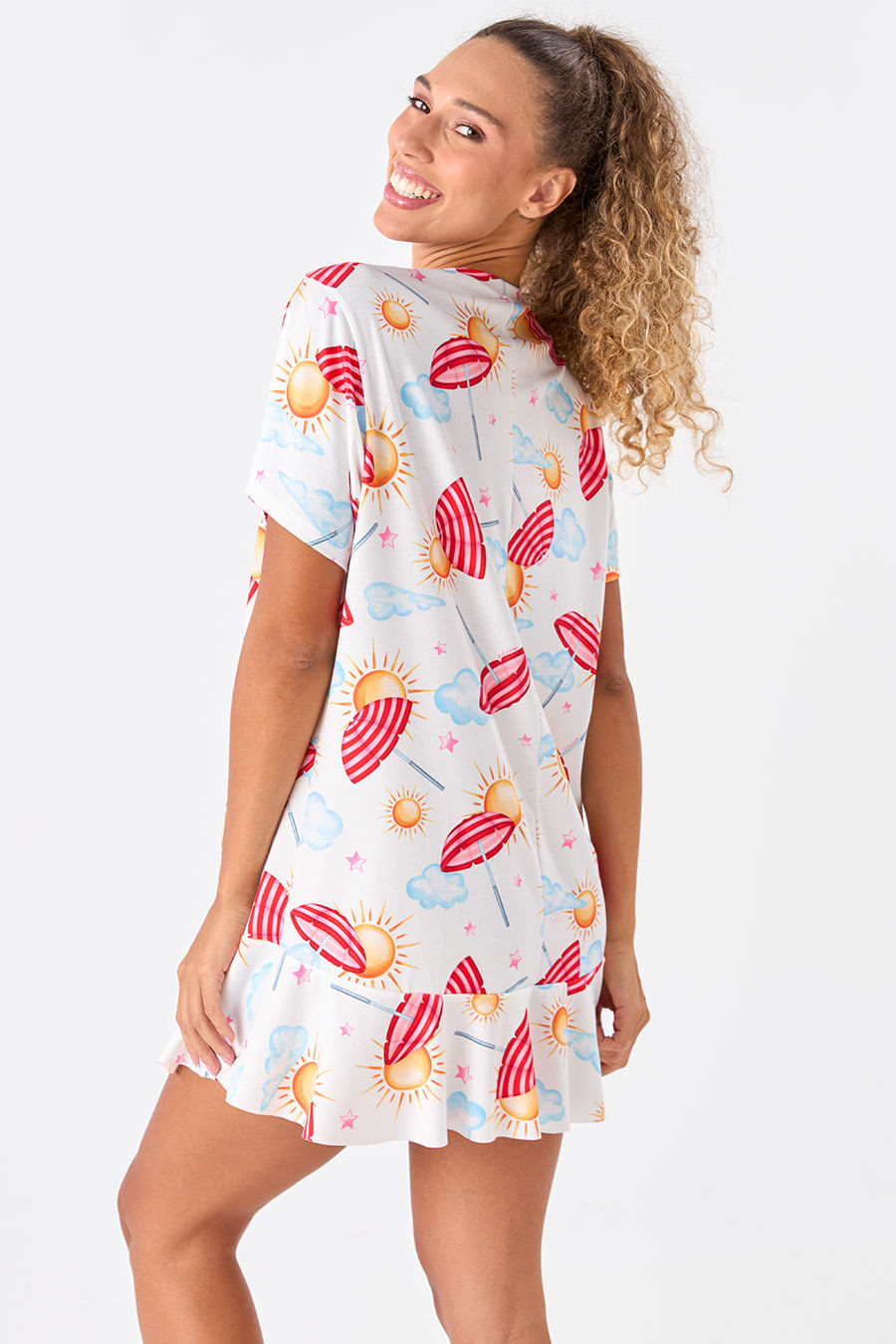 Com o calor do sol a brilhar e a brisa suave a nos acariciar, a coleção Gifts Férias chega com estampas para as suas noites que lembram as melhores férias e o espírito de liberdade.Imagine-se envolto em um toque suave enquanto desfruta das noites quentes, onde cada detalhe é pensado para que você possa sonhar com os dias ensolarados e momentos de pura alegria. Camisola ampla confeccionada em tecido Skin light, tecido bastante maleável e confortável. Perfeita para as noites de verão. Detalhes em babados para dar leveza e caimento na peça.