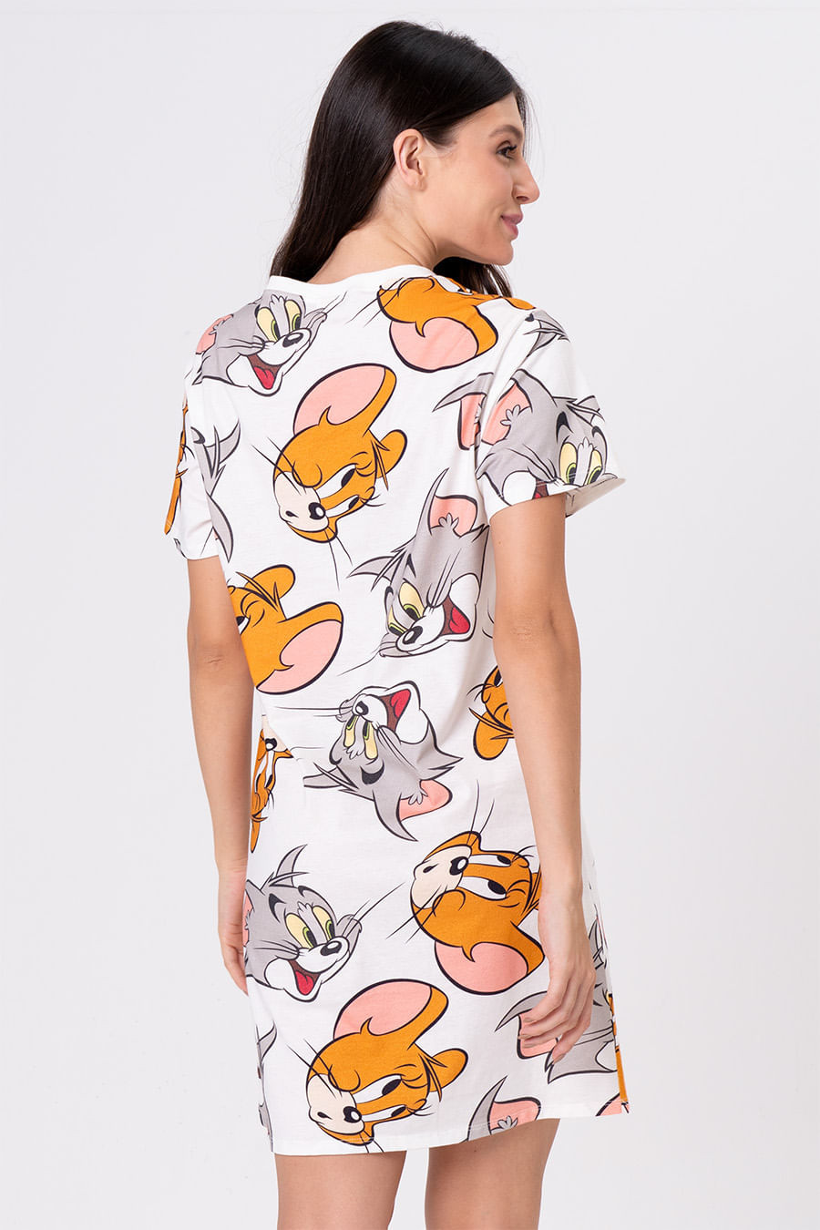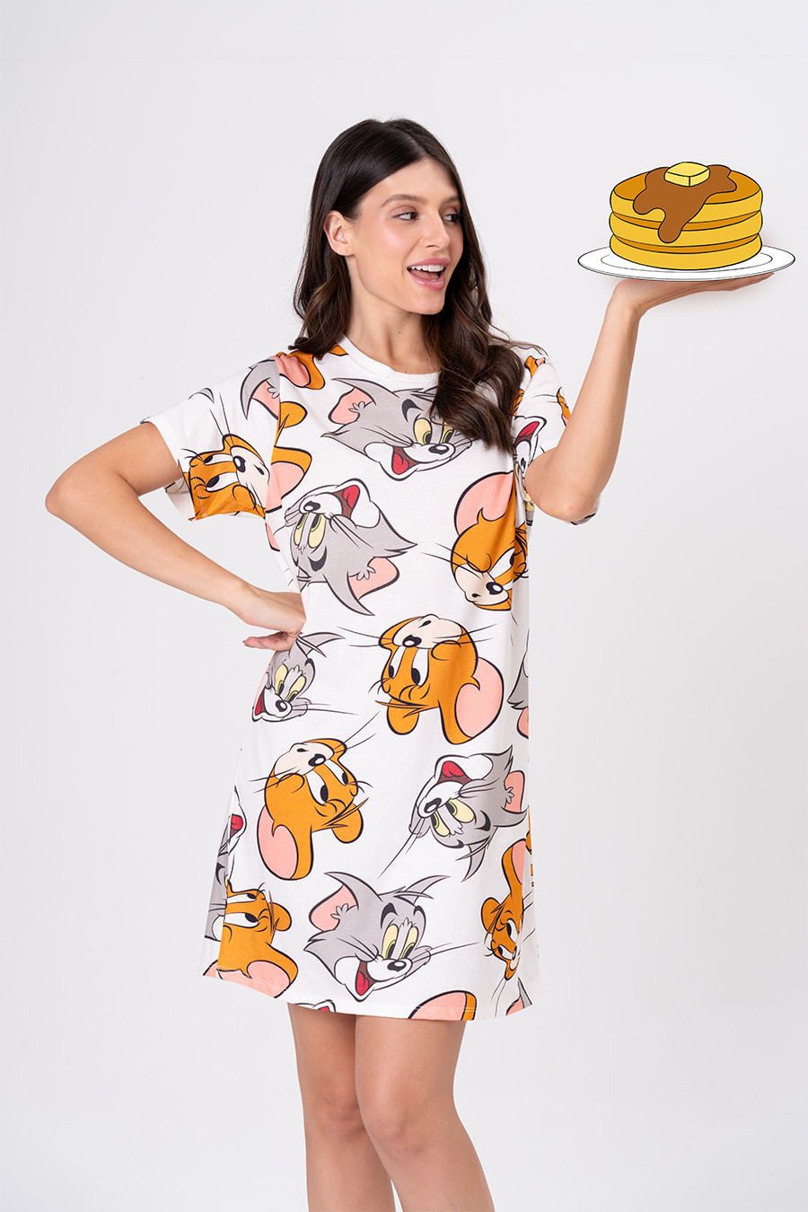 A nova coleção Diga Cheese é uma verdadeira explosão de alegria, inspirada na clássica e atemporal dupla Tom e Jerry, que representa a essência da diversão sem limites. Com cores vibrantes e personagens cativantes, a coleção traz à tona a nostalgia dos adultos, enquanto transmite uma energia de vivacidade e descontração, perfeita para toda família! Camisola na estampa exclusiva da coleção. Confeccionada em algodão, tecido bastante respirável, que regula a temperatura do corpo e evita a sensação de abafamento durante a noite. Fio natural, hipoalergênico que evita irritações na pele. Mangas curtas e comprimento médio, modelagem ampla que permite maior conforto nas suas noites de sono.Coleção Licenciada Oficial Warner Bros.