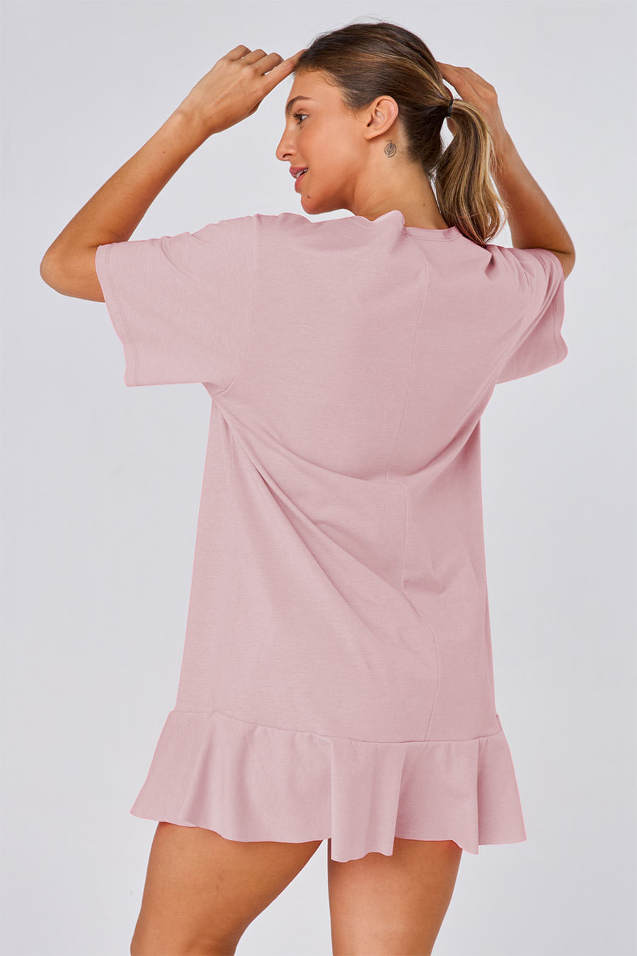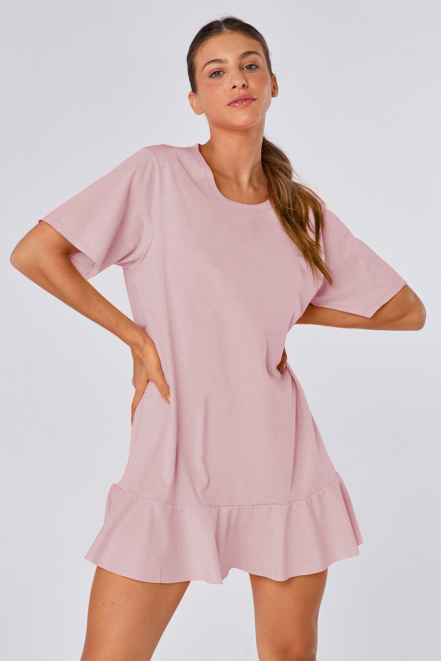 Camisola curta confeccionada em malha de algodão bastante respirável e confortável. Lisa na cor rosa, com babados no cós e mangas curtas.