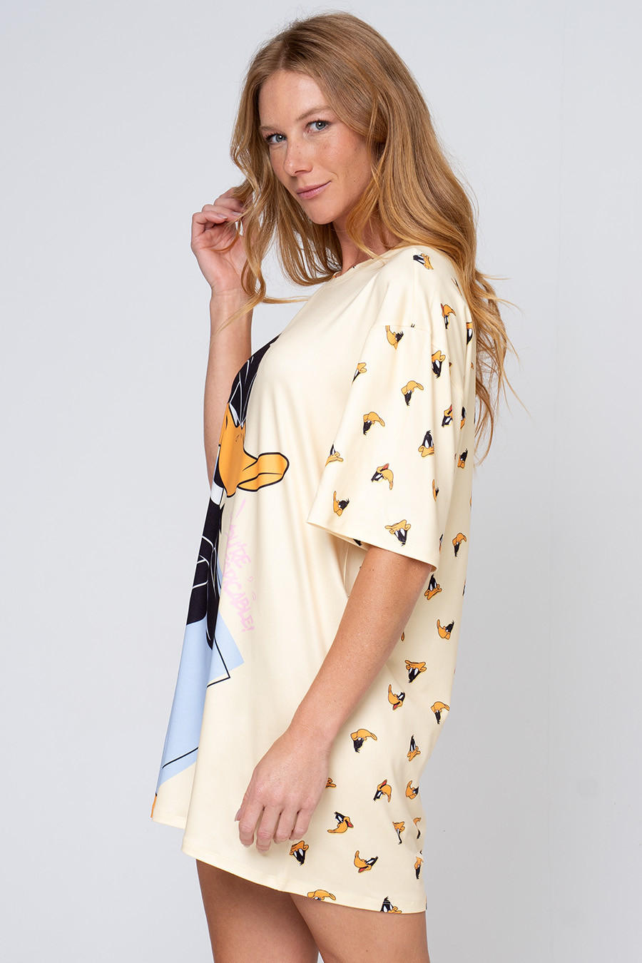 Camisola confeccionada em malha touch, com toque extremamente macio e confortável. Possui modelagem ampla, mangas curtas e estampa frontal do personagem Patolino em destaque, trazendo um visual divertido e descontraído. Ideal para noites leves e momentos de descanso, une conforto, praticidade e o charme dos personagens clássicos Looney Tunes. Coleção Licenciada Oficial Warner Bros.