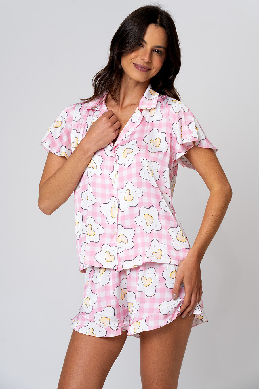 Conjunto confeccionado em tecido acetinado com toque de seda, leve e agradável ao vestir, ideal para momentos de descanso com conforto e frescor. A blusa possui gola clássica, fechamento por botões e mangas curtas, garantindo praticidade e caimento solto. O short apresenta elástico no cós para melhor ajuste ao corpo e acabamento com delicados babados na barra, que acrescentam movimento, feminilidade e um toque romântico à peça, mantendo o visual descontraído e charmoso da coleção.