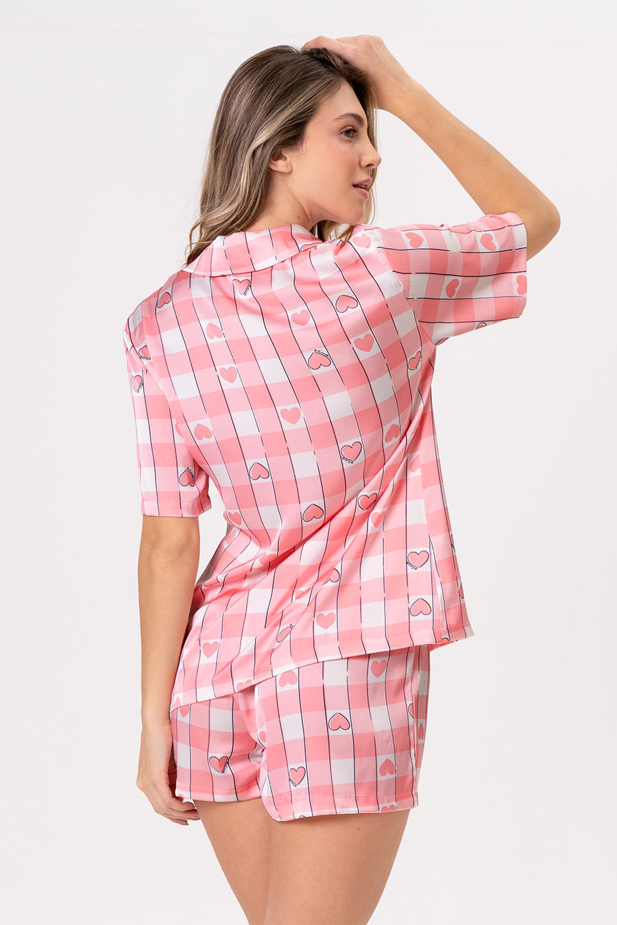 A coleção Pinknic traz uma versão jovem e animada do clássico vichy, com um toque lúdico que reflete momentos de aconchego e descontração.Perfeita para mulheres modernas e românticas, ela combina frescor e sofisticação, sendo uma escolha ideal para um presente único. Pijama curto estilo americano confeccionado em tecido acetinado Gloss, com toque de seda, que proporciona liberdade de movimento. O conjunto conta com blusa de mangas curtas, com abotoamento frontal, perfeito para amamentar, e decote em V. Short possui elástico e gorgorão em seu cós que se ajusta perfeitamente à cintura, garantindo conforto e facilidade ao vestir.