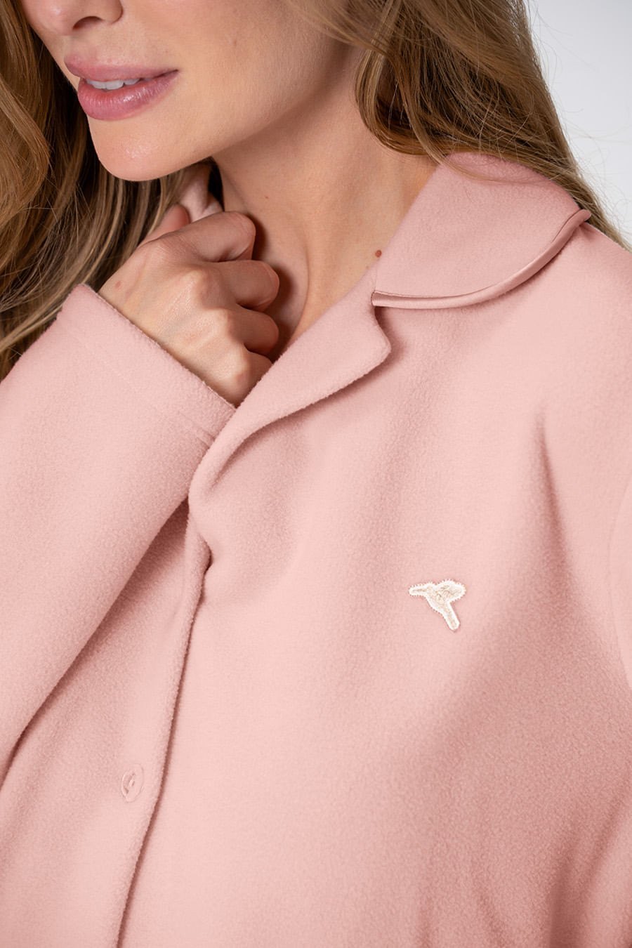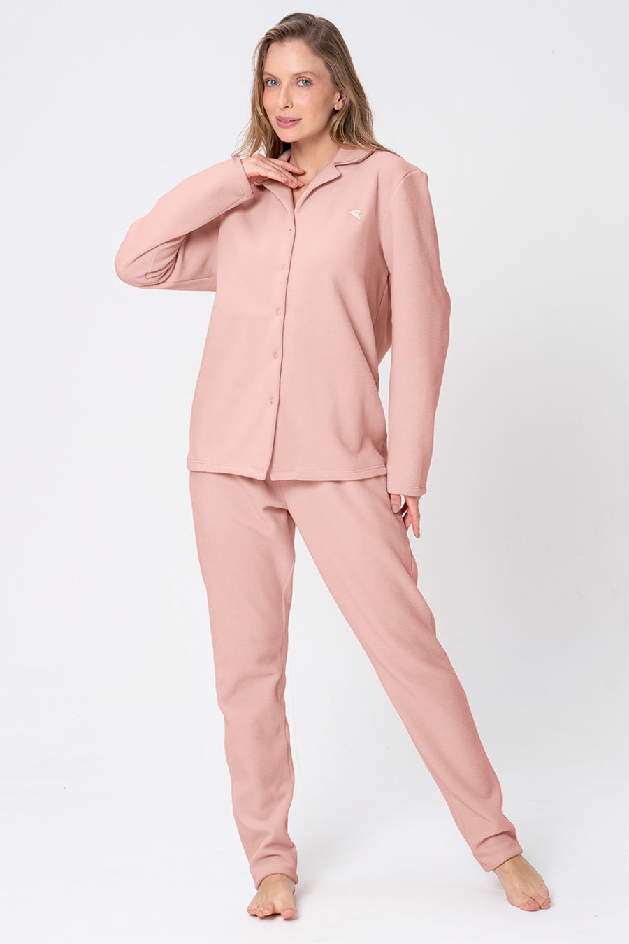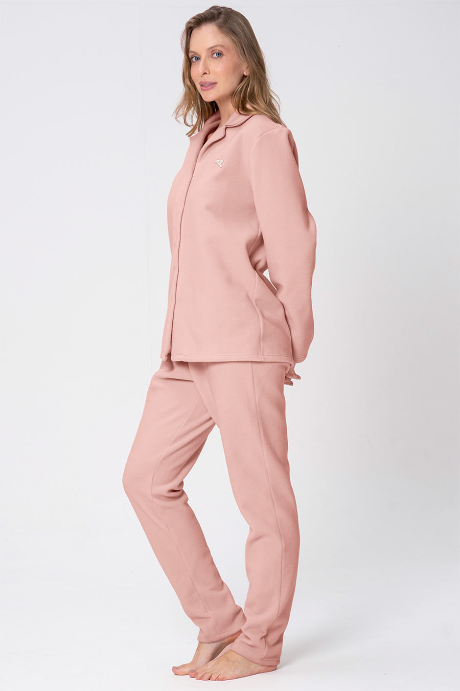 Confeccionados em soft, super quentinho apropriado para os dias frios, a coleção Clássicos Soft traz peças com modelagens básicas soltinhas ao corpo priorizando o conforto e aconchego de toda a família. Todo liso na cor Rosê. Blusa possui abotoamento frontal com silk localizada na parte superior esquerda. Calça com elástico no cós para maior ajuste ao corpo.