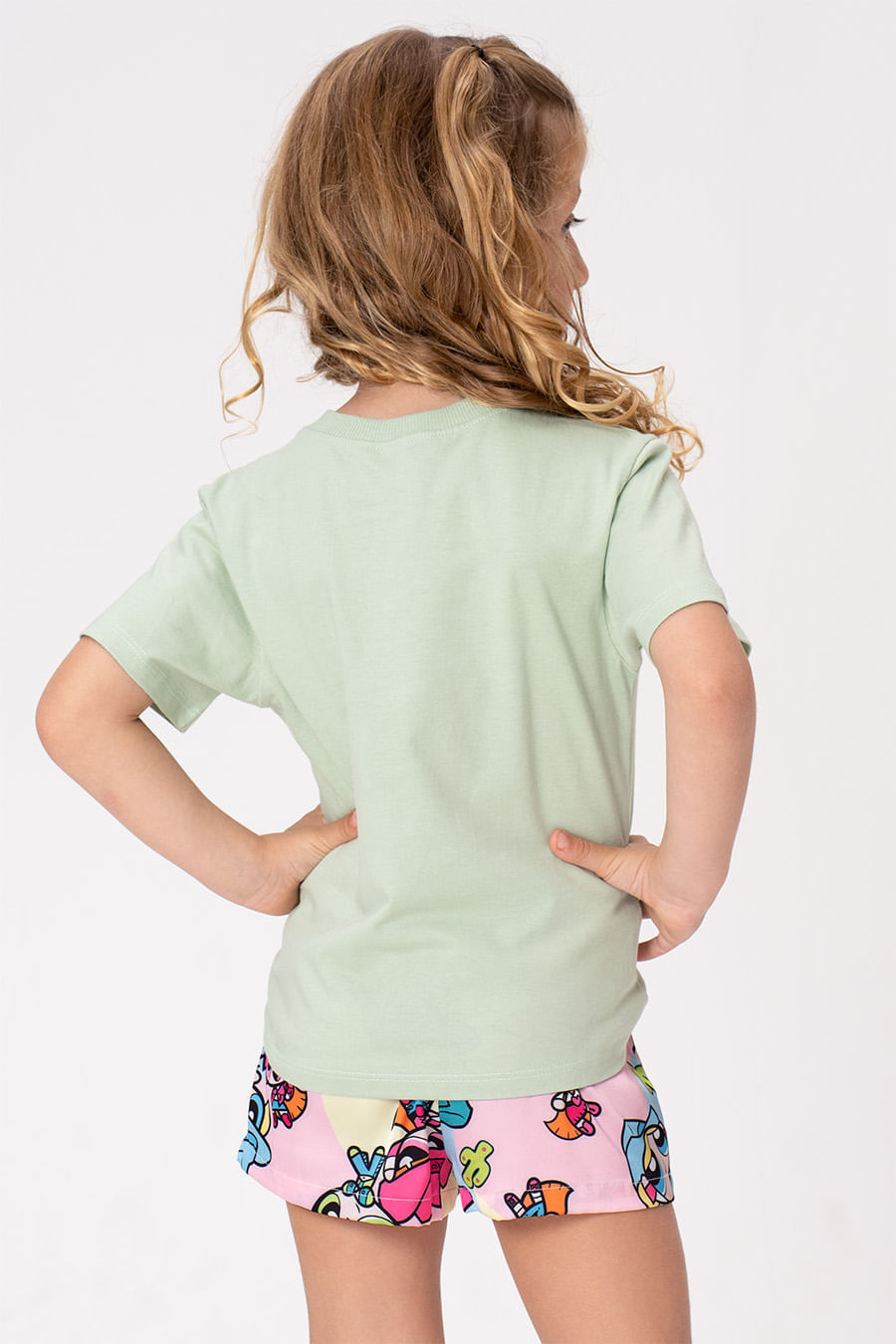 A versão infantil da coleção traz a camiseta em verde pastel, com caimento soltinho e aplicação delicada das iniciais "PPG" no mesmo tom. Feita em meia malha 100% algodão, oferece o toque suave que as crianças amam e os pais confiam.