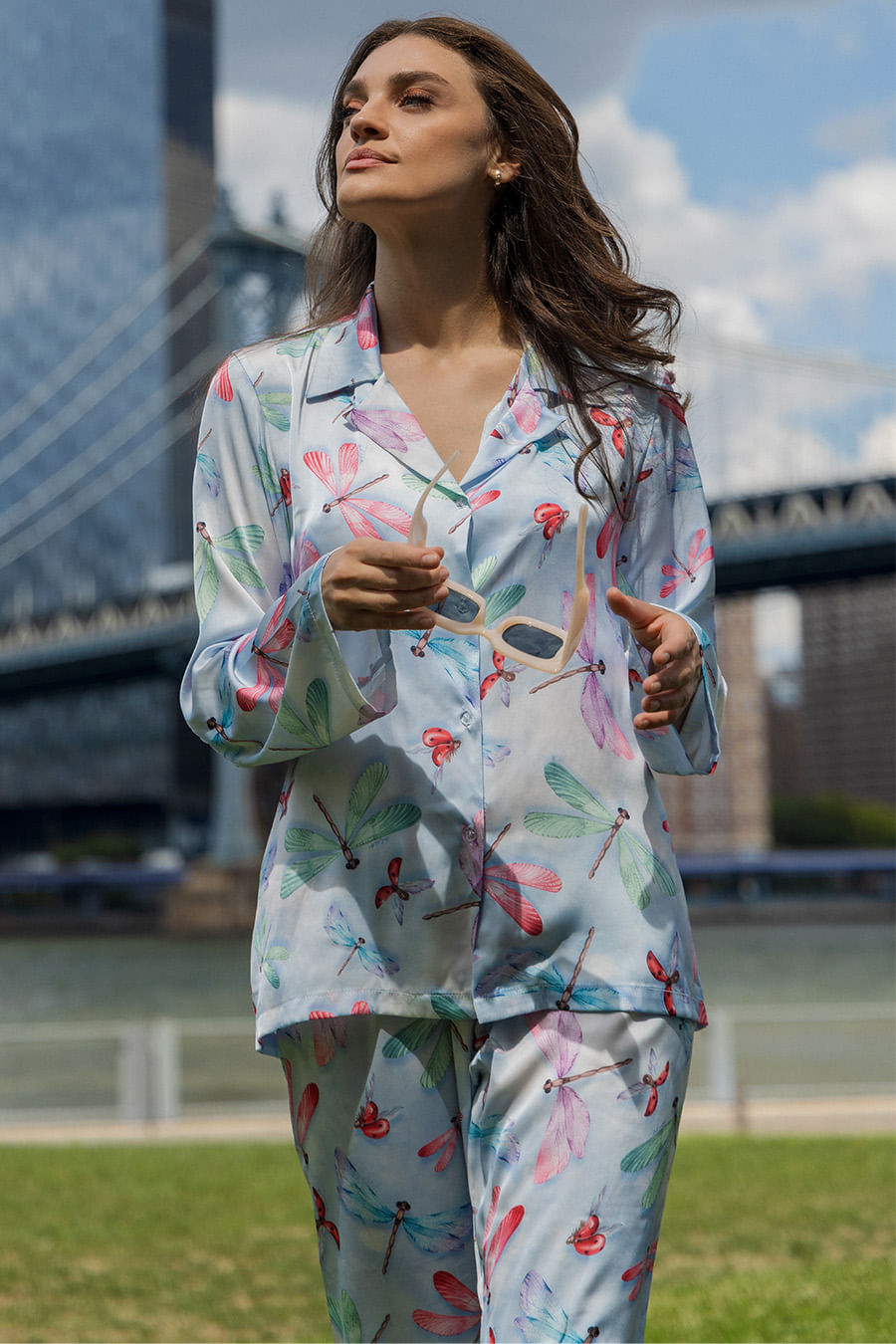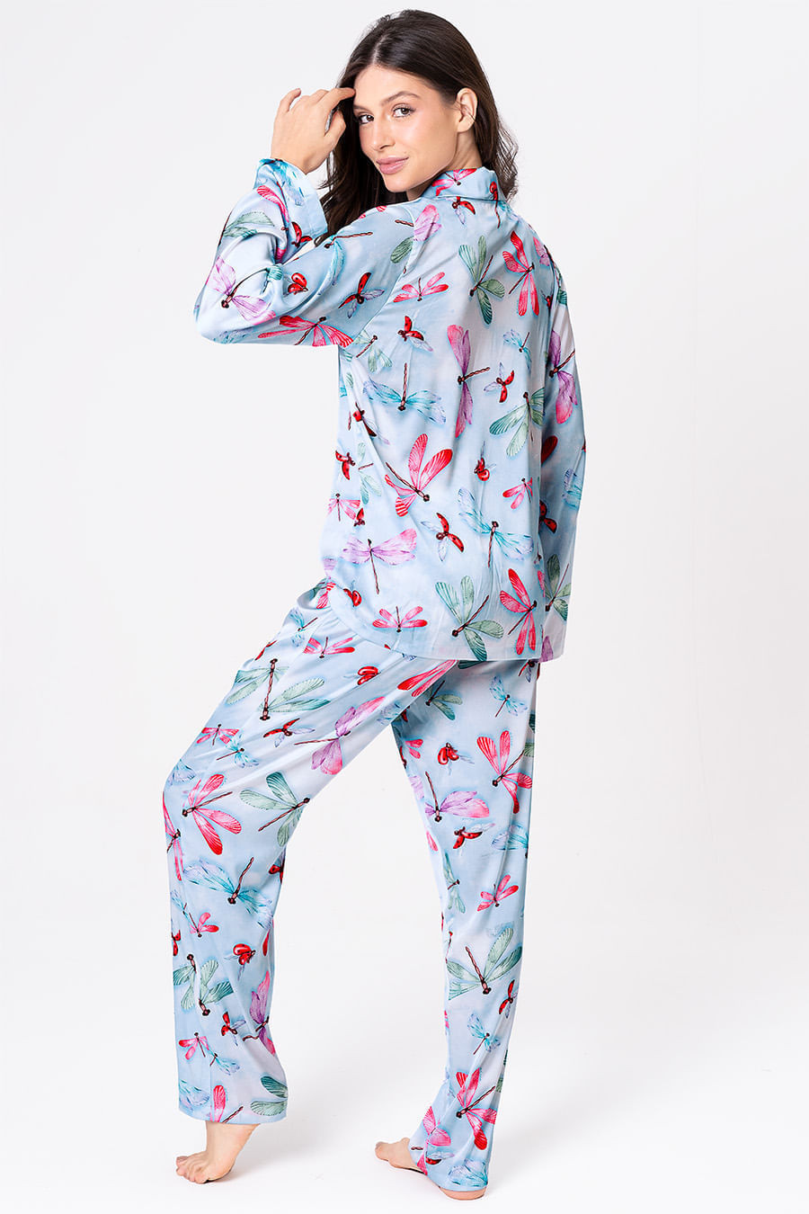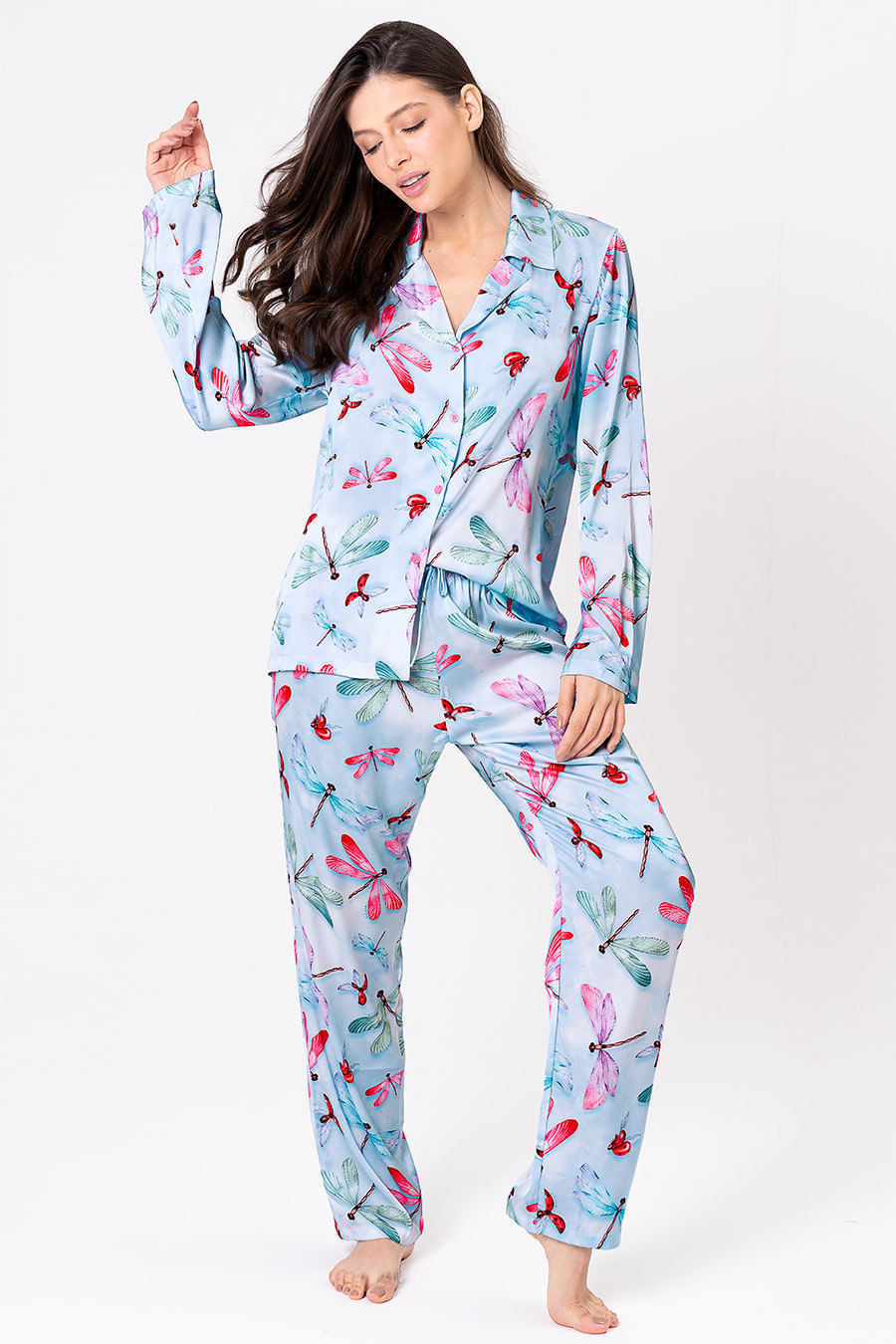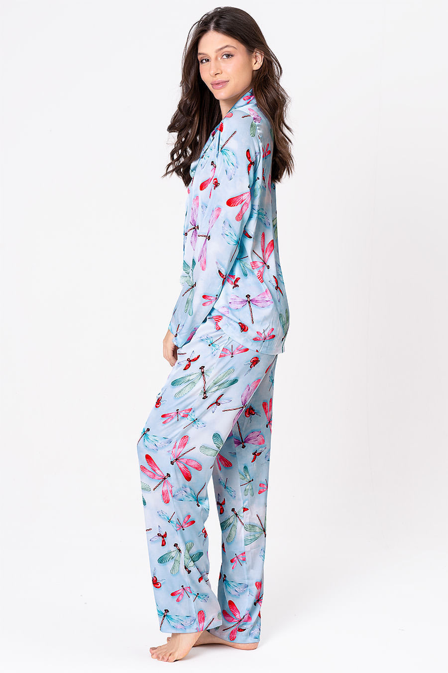 A coleção Libélula traz a graça da mulher em cada detalhe, refletindo sua capacidade de transformação, equilíbrio e leveza. Assim como a libélula que dança com o vento, cada peça celebra a essência feminina, forte e delicada, pronta para se reinventar a cada momento. O pijama longo estilo americano é confeccionado em tecido acetinado Gloss, proporcionando liberdade de movimento, com textura macia e elastano em sua composição. Conjunto, na estampa exclusiva da coleção, conta com blusa de mangas longas, abotoamento frontal perfeito para amamentar, e decote em V. A calça possui elástico e gorgorão em seu cós, ajustando-se perfeitamente à cintura, garantindo conforto e facilidade ao vestir.