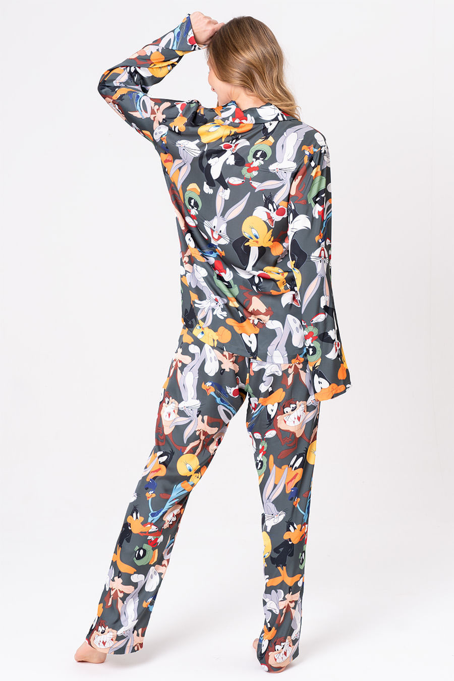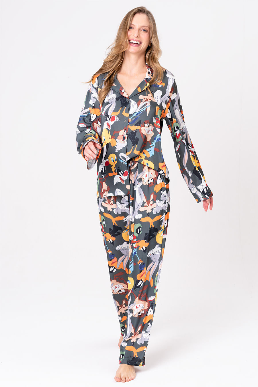 A nova coleção Looney Hollywood traz as nossas maiores estrelas de volta! A turma da diversão retorna em uma estampa moderna, que faz referência aos icônicos camuflados, mas com um toque vibrante e cheio de personalidade. Cada personagem reflete sua essência única, permitindo que todos se identifiquem com um ou mais deles. Quando o assunto é diversão e felicidade, os Looney Tunes são, sem dúvida, as verdadeiras estrelas! Pijama longo estilo americano é confeccionado em tecido acetinado Gloss, proporcionando liberdade de movimento, com textura macia e elastano em sua composição. Conjunto, na estampa exclusiva da coleção, conta com blusa de mangas longas, abotoamento frontal perfeito para amamentar, e decote em V. A calça possui elástico e gorgorão em seu cós, ajustando-se perfeitamente à cintura, garantindo conforto e facilidade ao vestir. Coleção Licenciada Oficial Warner Bros.
