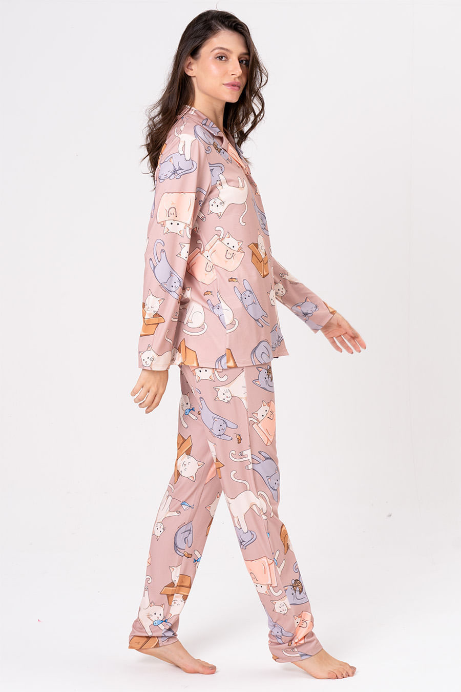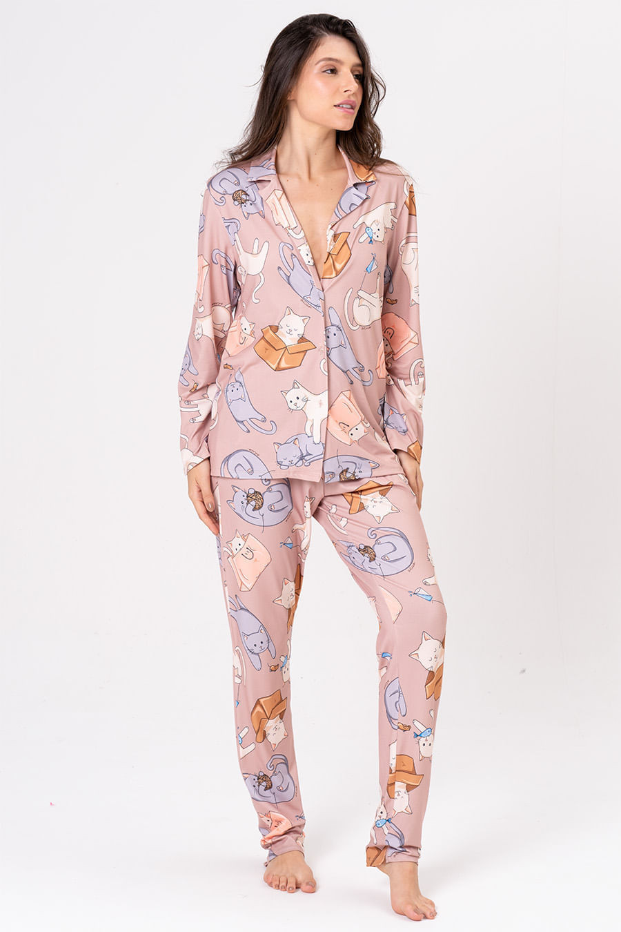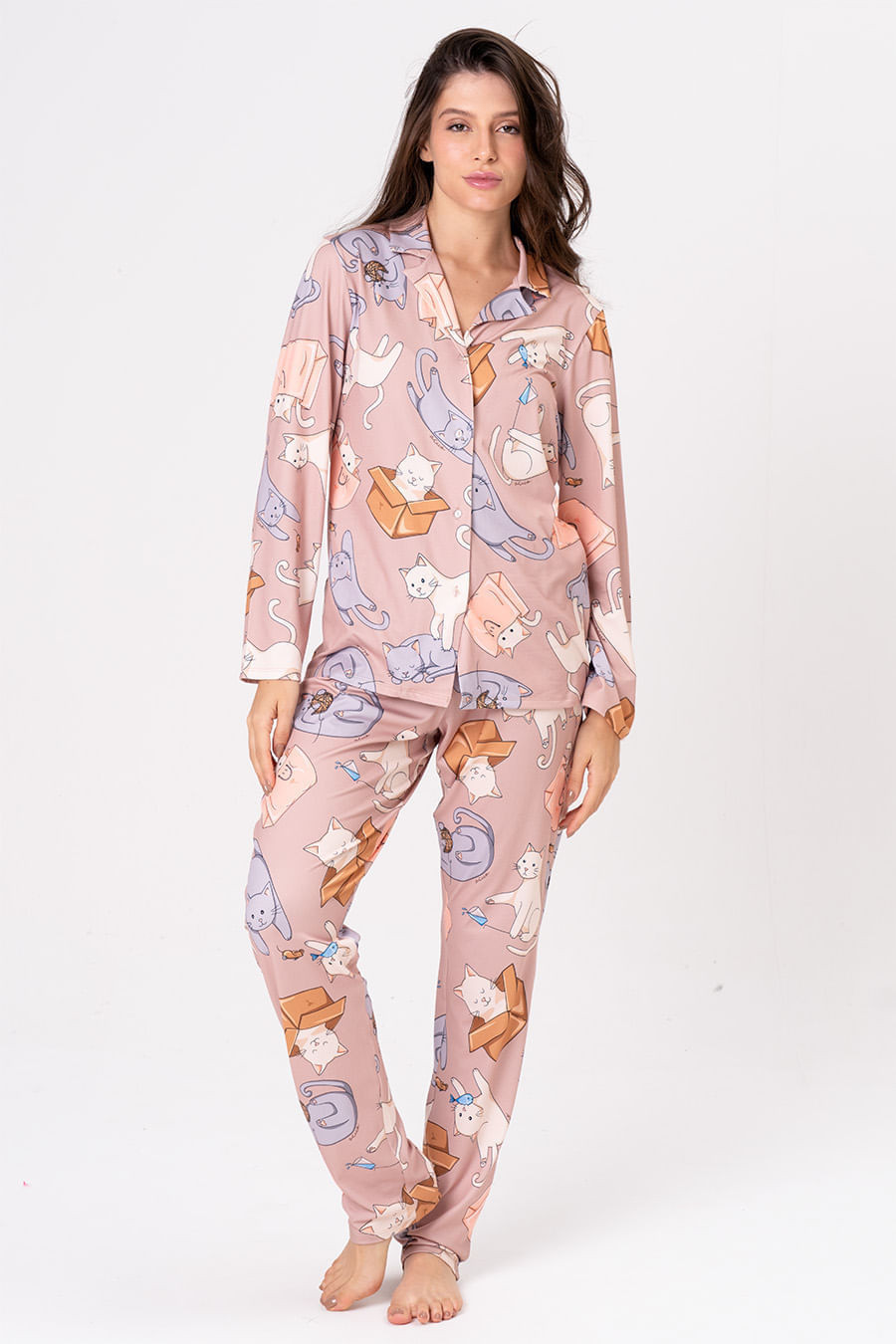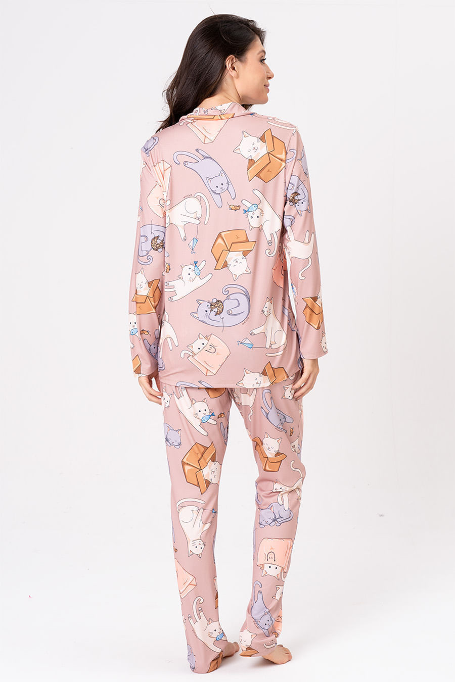 A coleção Gatices traduz toda a alegria e leveza de conviver com pets bagunceiros em casa. A coleção celebra as nossas alegrias do dia a dia com os gatinhos: momentos espontâneos de diversão e travessura, como se esconder em caixas, derrubar copos ou amassar pãozinho. Pijama longo estilo americano confeccionado em malha que proporciona uma sensação extremamente confortável e macia. Conta com blusa de mangas longas, com abotoamento frontal, perfeito para amamentar, e decote em V. Calça possui elástico e gorgorão em seu cós que se ajusta perfeitamente à cintura, garantindo conforto e facilidade ao vestir.