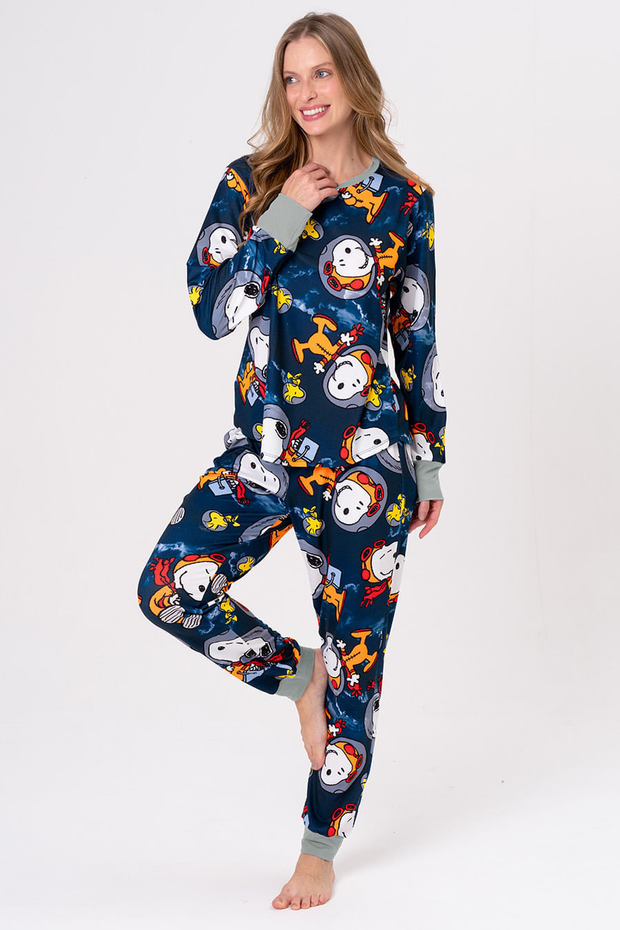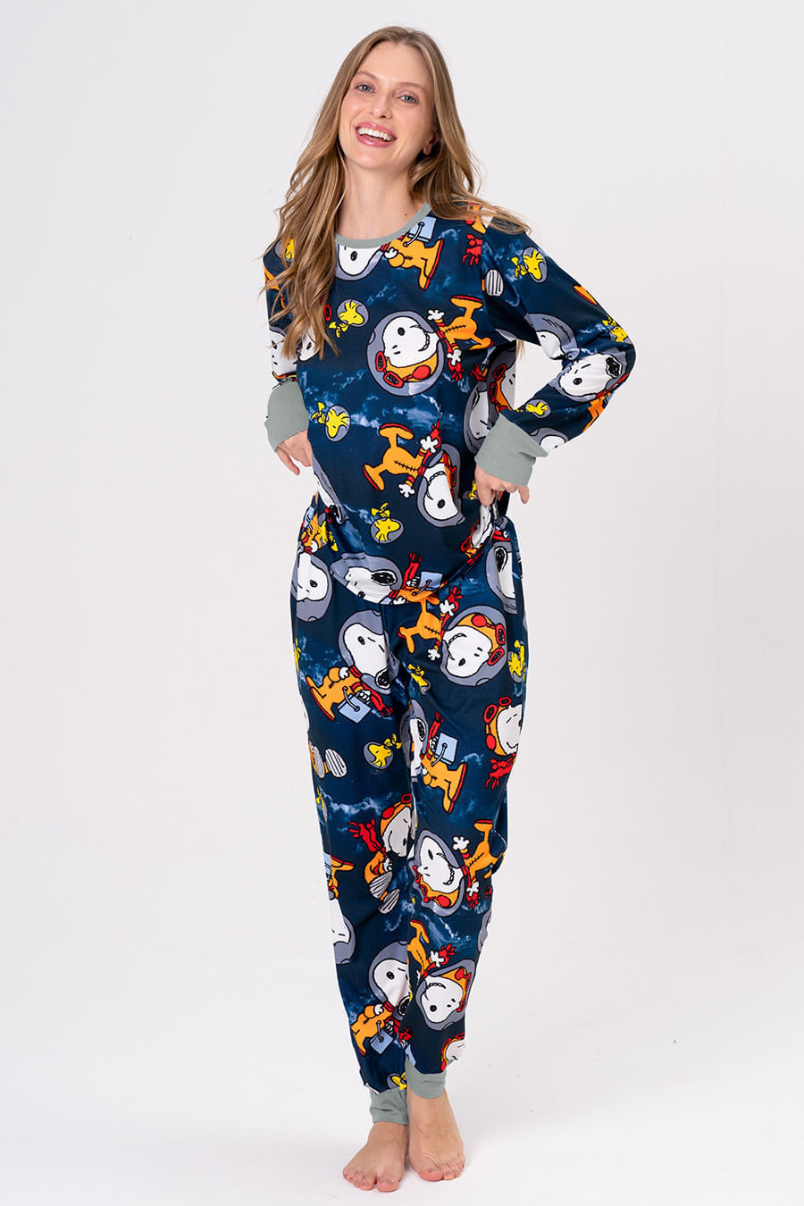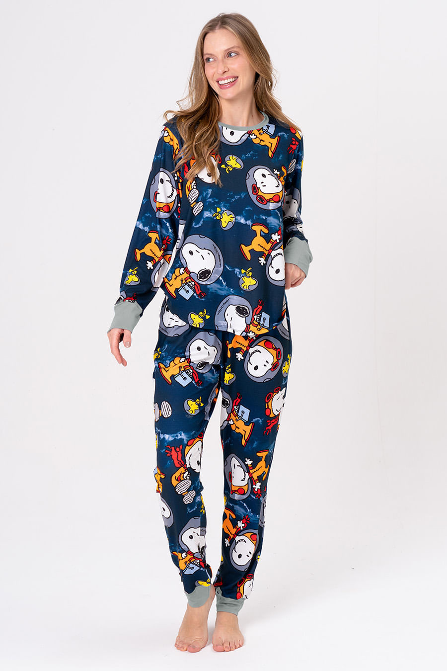Snoopy foi o primeiro cachorro a ir ao espaço, e agora, embarca em uma nova missão! A coleção Snoopy Nauta chega em cores neon e cheia de personalidade, despertando a criatividade para noites de diversão em família. Seja construindo foguetes com caixas ou curtindo um filme com pipoca, a coleção Snoopy Nauta leva o universo Peanuts do nosso beagle favorito direto para casa. Pijama longo com a estampa exclusiva da coleção. Blusa com mangas longas e decote redondo. Calça com elástico na cintura e gorgorão para melhor ajuste na cintura. Combine com toda a família com os outros pijamas da coleção!