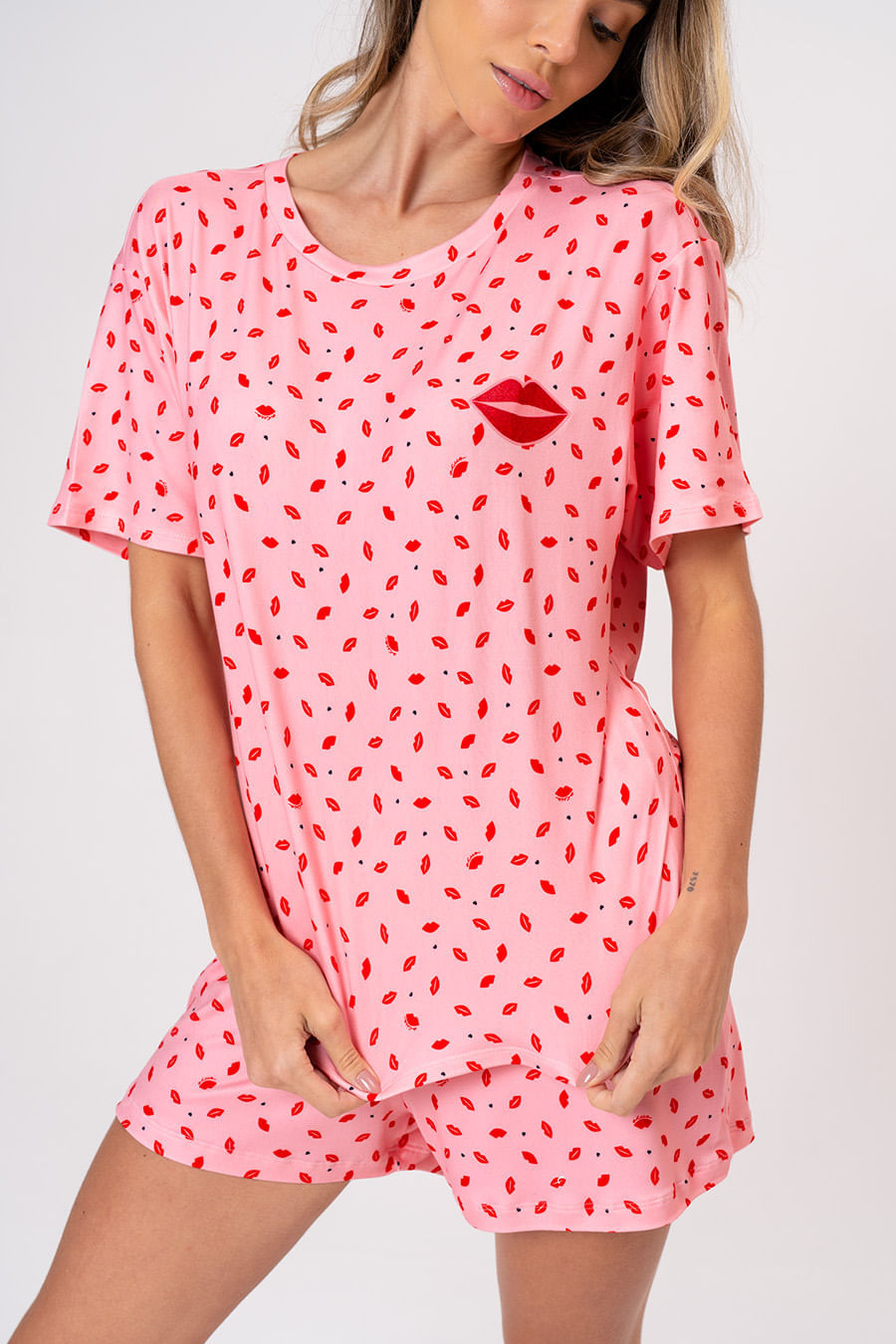 Na coleção Desejos a maçã é o símbolo central, um fruto carregado de sensualidade, mistério e poder. Deixamos de lado as frutas comuns para destacar esse ícone de desejo e juventude, que nas lendas nórdicas concedia eternidade às Deusas. Com estampas que evocam o "sexy sem ser vulgar" e uma paleta de cores quentes, a coleção celebra a mulher que se conhece, com elegância expressa sua liberdade. É sobre vestir o instinto com sofisticação. Conjunto confeccionado em tecido macio com sensação de pele hidratada, na estampa exclusiva da coleção, tecido bastante maleável e confortável. Blusa contém gola redonda e mangas curtas. Short possui elástico e gorgorão em seu cós que se ajusta perfeitamente à cintura, garantindo conforto e facilidade ao vestir.