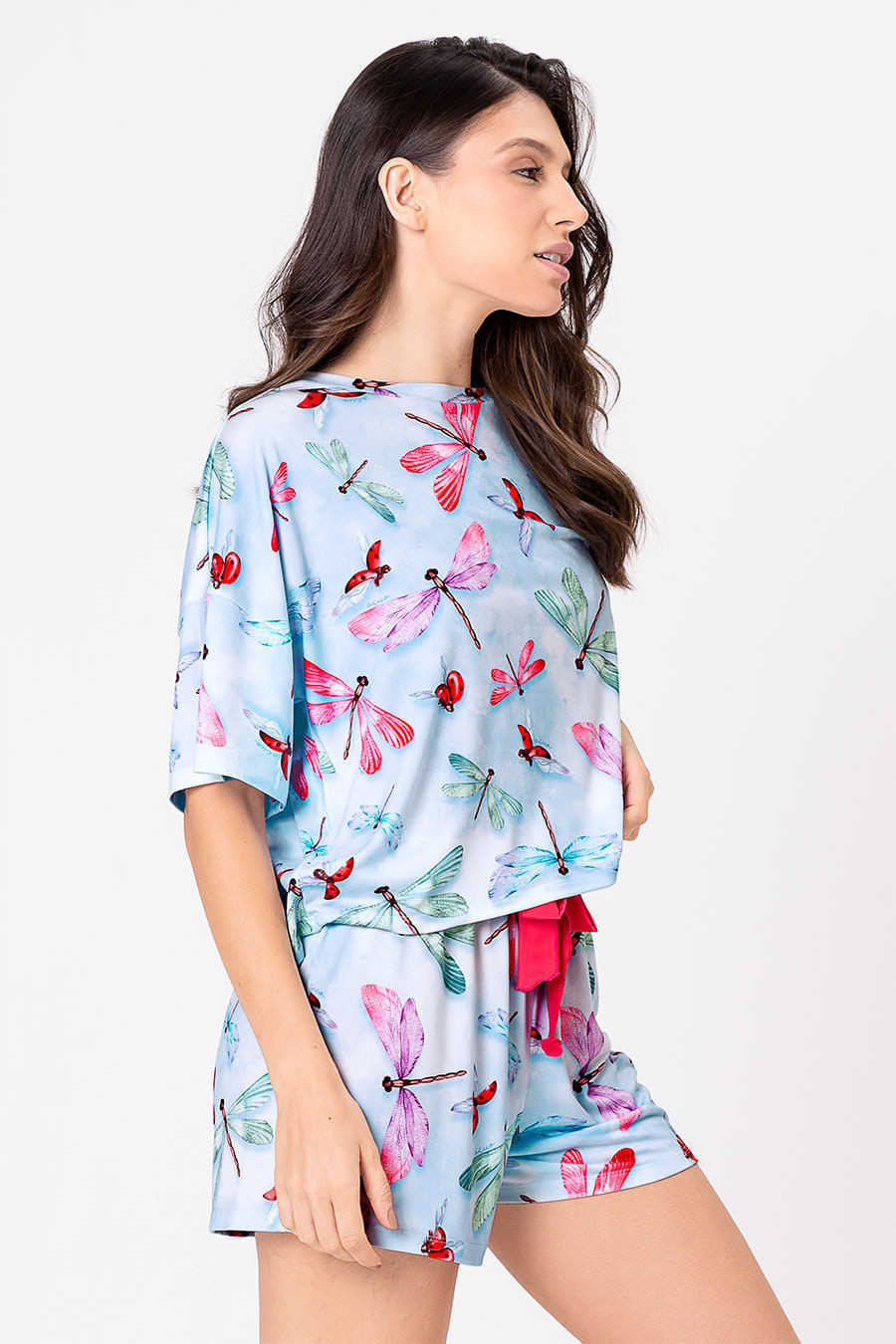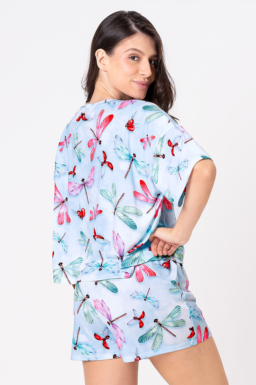 A coleção Libélula traz a graça da mulher em cada detalhe, refletindo sua capacidade de transformação, equilíbrio e leveza. Assim como a libélula que dança com o vento, cada peça celebra a essência feminina, forte e delicada, pronta para se reinventar a cada momento. Conjunto confeccionado em tecido macio com sensação de pele hidratada, na estampa exclusiva da coleção, tecido bastante maleável e confortável. Blusa contém gola redonda e mangas curtas. Short possui elástico e gorgorão em seu cós que se ajusta perfeitamente à cintura, garantindo conforto e facilidade ao vestir.