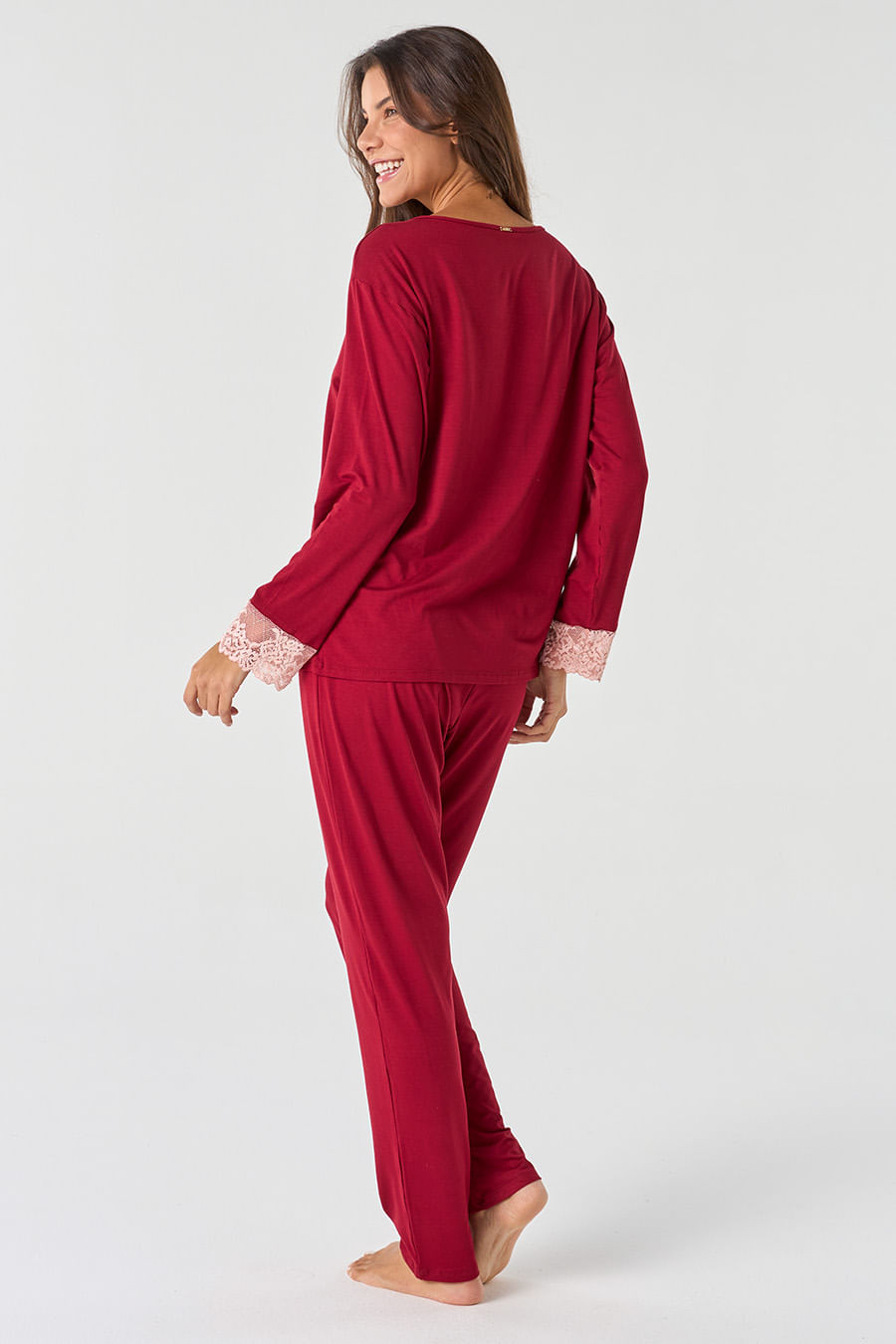 Básico e clássico, com cores sólidas e sem muitos detalhes, a coleção Clássicos Viscose é versátil e fácil de agradar. Ideal para presentear ou para se tornar seu pijama básico favorito. A malha de viscose tem um caimento confortável que se adapta ao corpo de forma lisonjeira, realçando a silhueta com sofisticação. A blusa tem mangas longas, decote redondo e punho com detalhes em renda. A calça tem modelagem reta com elástico que proporciona maior ajuste ao corpo.