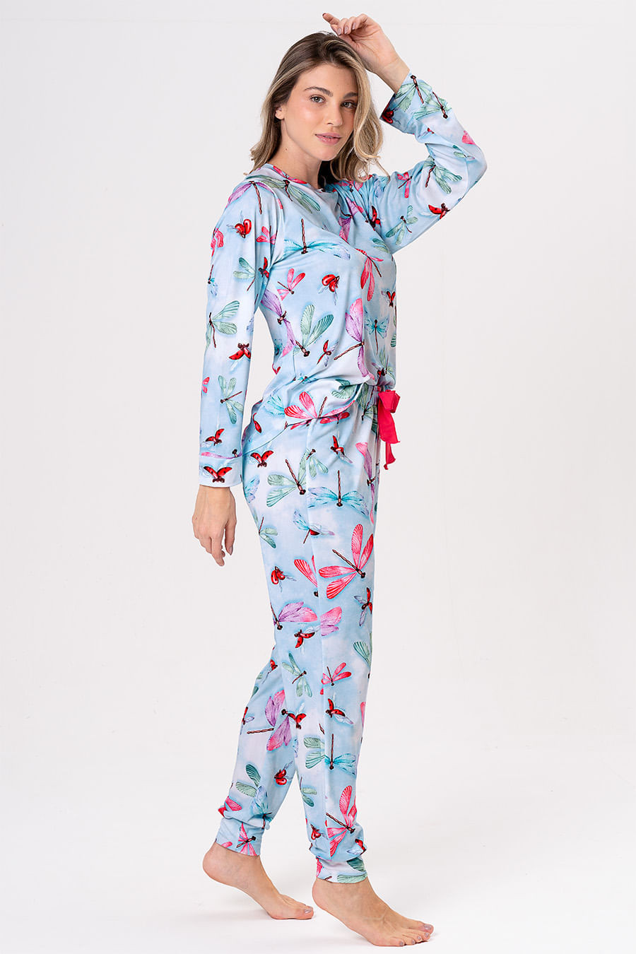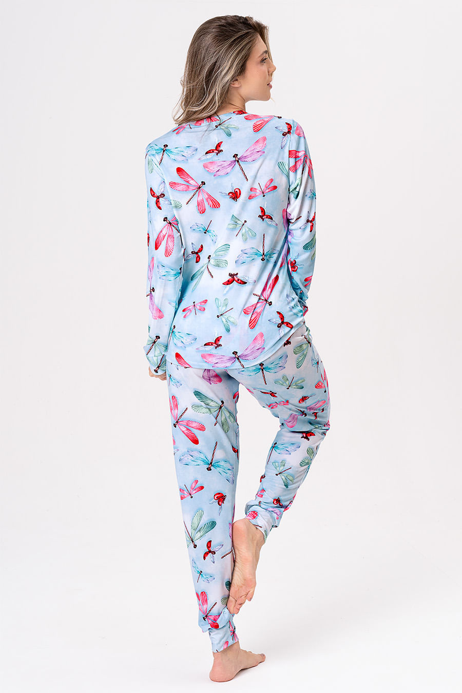 A coleção Libélula traz a graça da mulher em cada detalhe, refletindo sua capacidade de transformação, equilíbrio e leveza. Assim como a libélula que dança com o vento, cada peça celebra a essência feminina, forte e delicada, pronta para se reinventar a cada momento. Conjunto confeccionado em tecido macio com sensação de pele hidratada, na estampa exclusiva da coleção. Blusa com mangas longas e decote redondo. Calça com elástico na cintura e gorgorão para melhor ajuste na cintura.