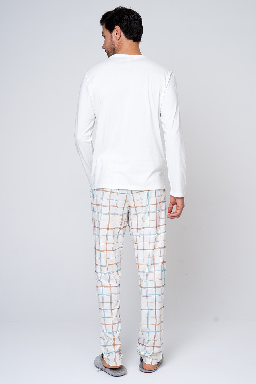 O conjunto masculino é confeccionado em meia malha, oferecendo toque macio e caimento confortável. A blusa de mangas longas tem modelagem clássica e clean, ideal para o uso diário. A calça conta com elástico no cós, garantindo ajuste prático e confortável, além de bolsos laterais que trazem funcionalidade ao modelo, mantendo a proposta descomplicada e aconchegante da coleção.