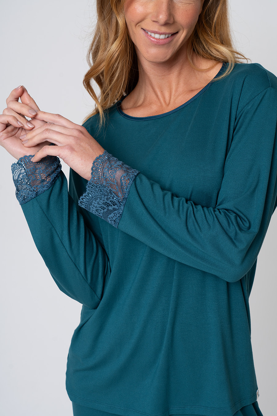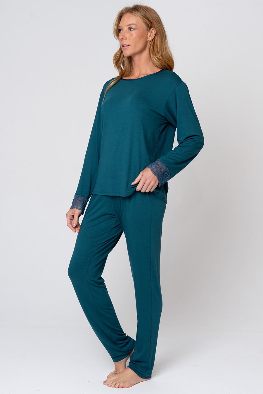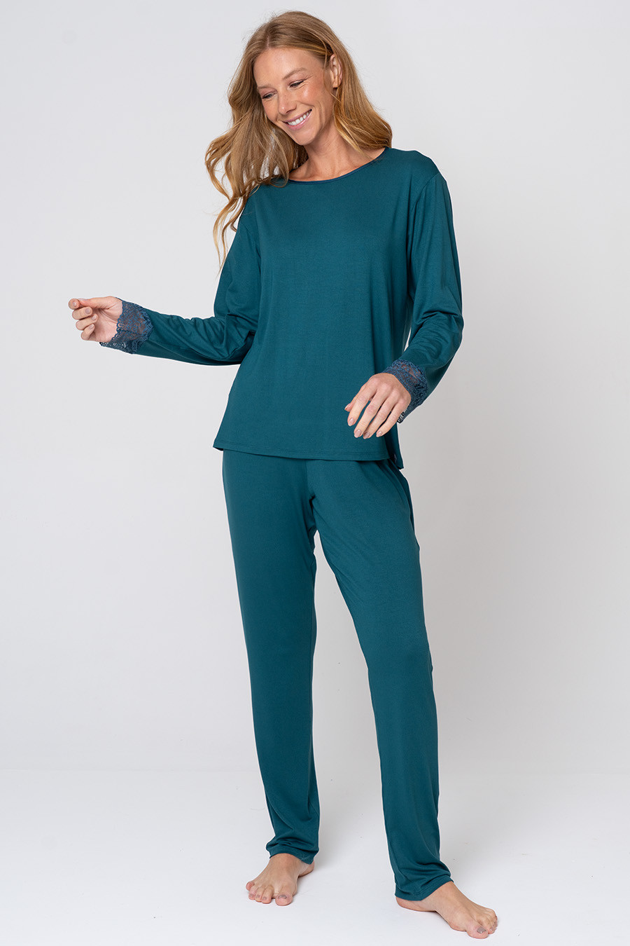 O pijama em malha de viscose possui toque macio e caimento leve, proporcionando conforto ao vestir. Com blusa de mangas longas e decote redondo, a peça ganha um toque delicado com o detalhe em renda nos punhos, enquanto a calça de modelagem confortável com cós em elástico completa o conjunto com leveza e bem-estar para os momentos de descanso.