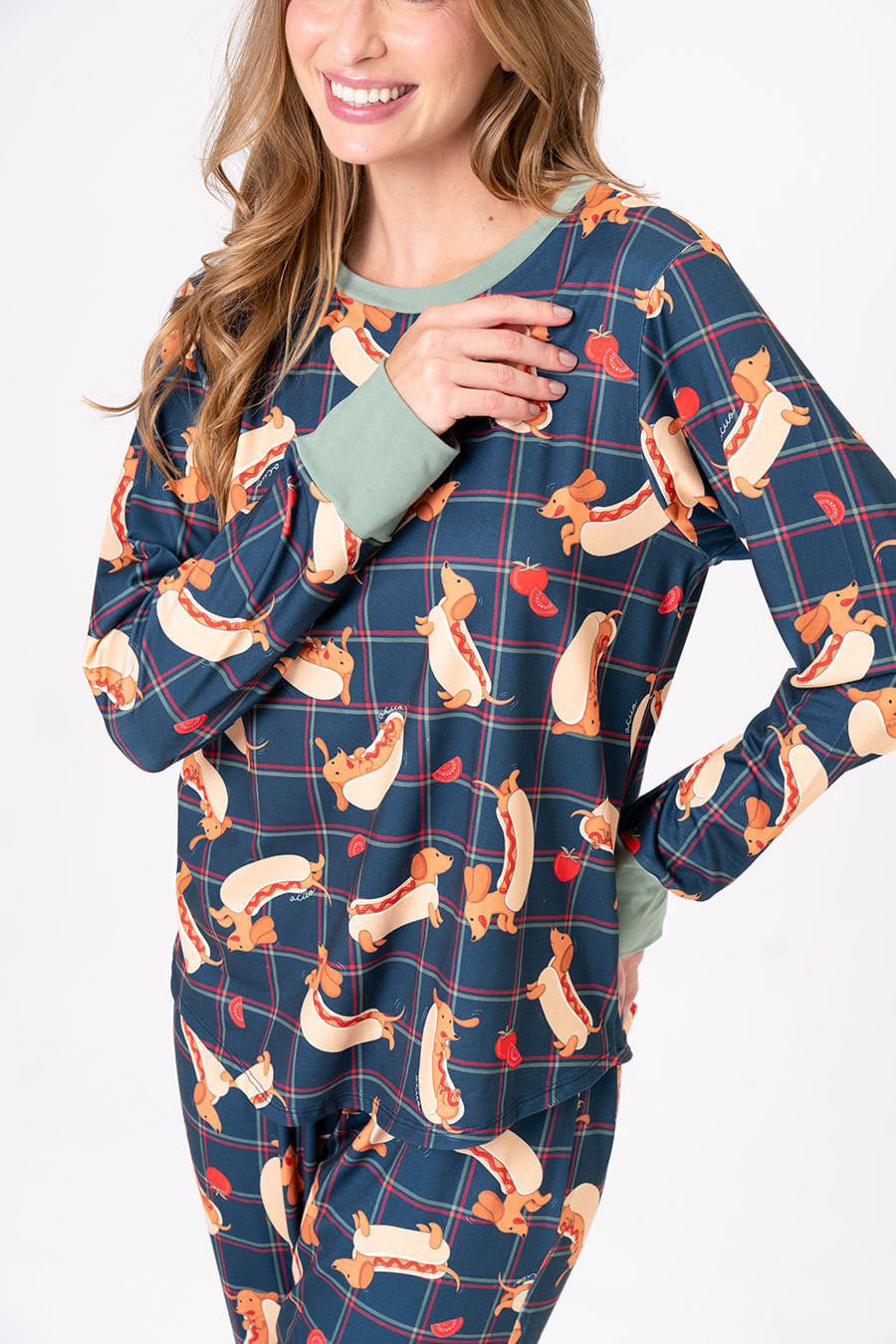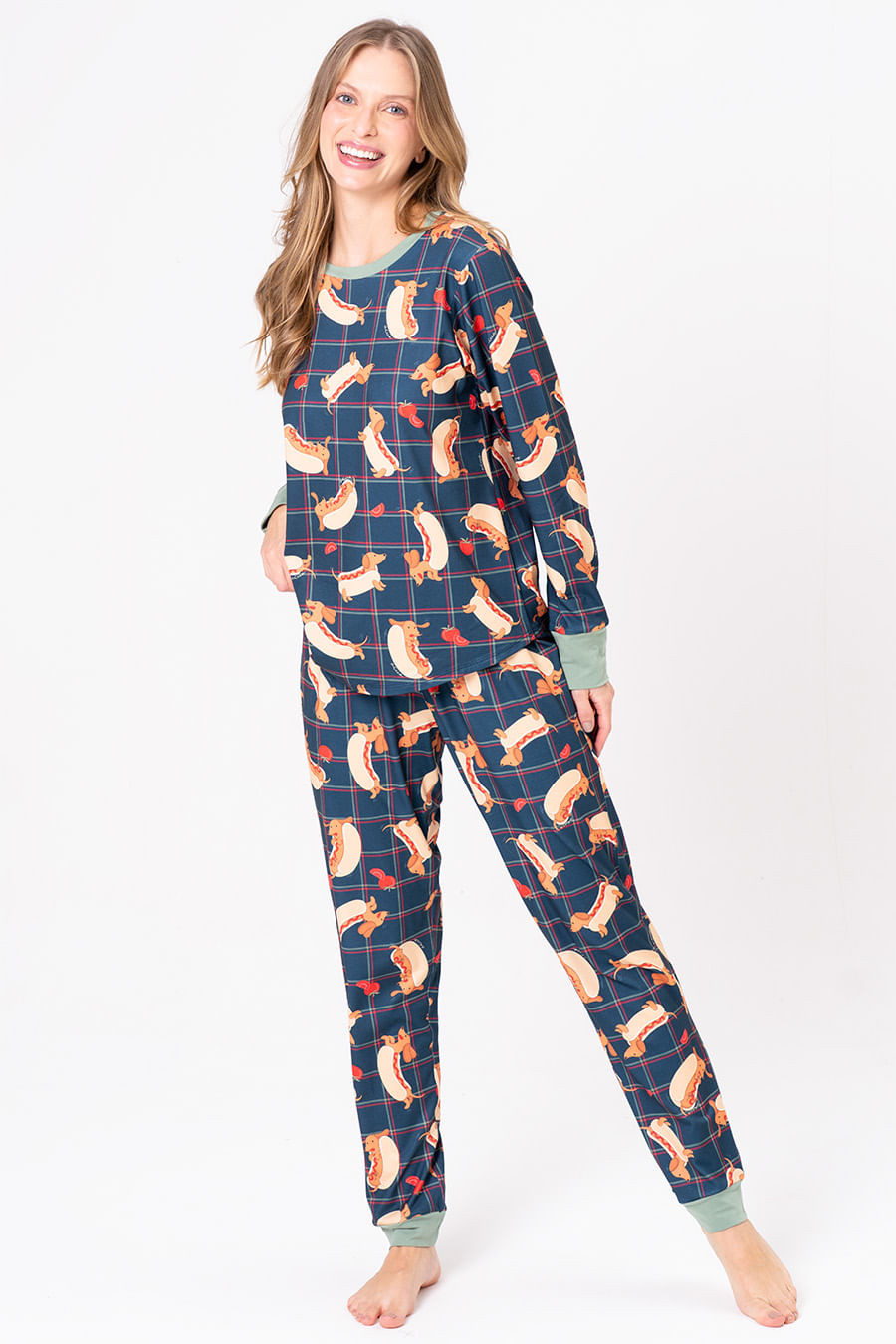 A coleção Hot Dog é uma estampa divertida que une o charme do cachorro salsicha com o clássico cachorro-quente. Criativa e irreverente, a estampa celebra o amor pelos pets, nossos companheiros inseparáveis do dia a dia, ao mesmo tempo em se conecta à tendência das comidinhas afetivas, que trazem lembranças de casa e sabores que unem a família. Blusa com mangas longas e decote redondo. Calça com elástico na cintura para melhor ajuste na cintura.