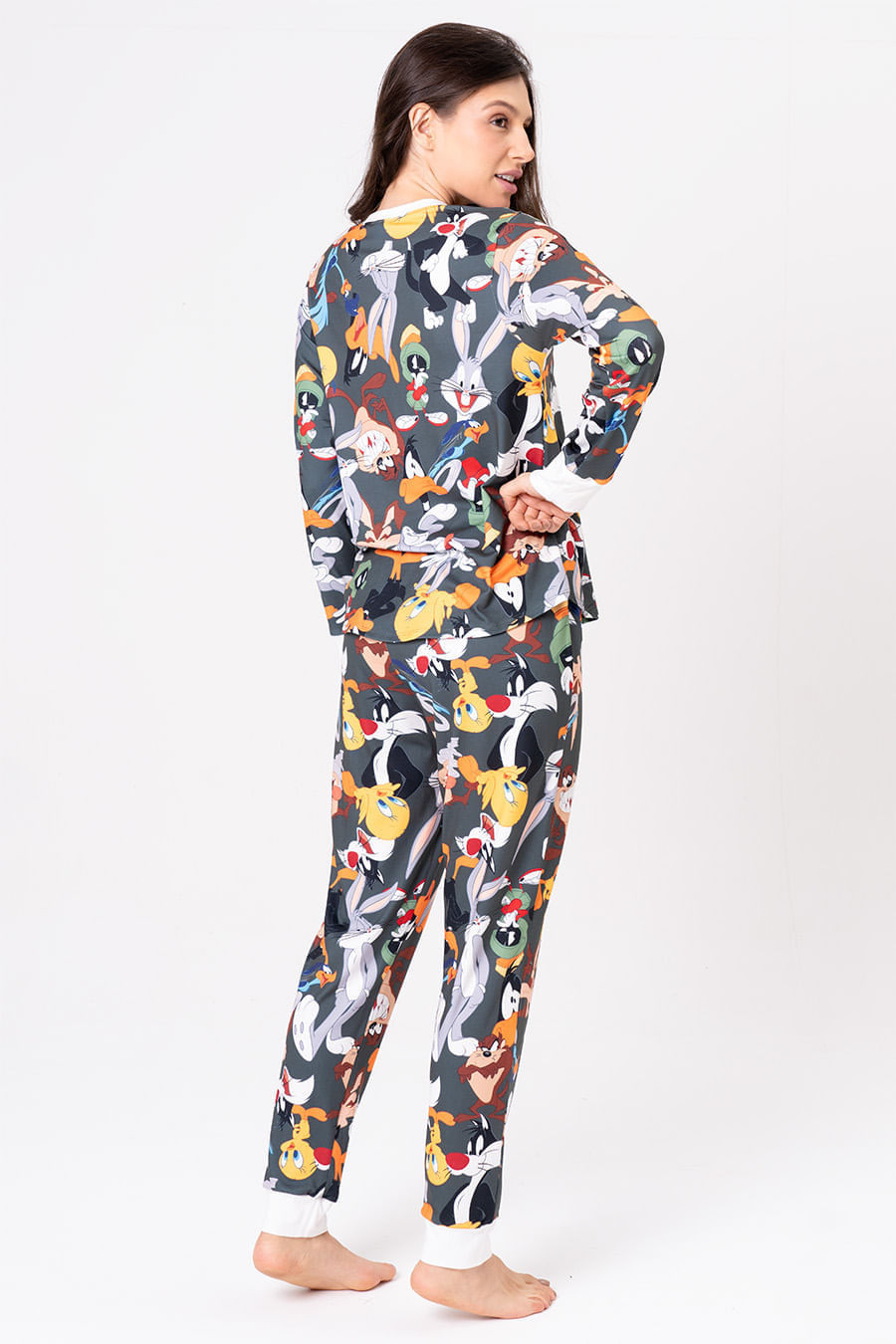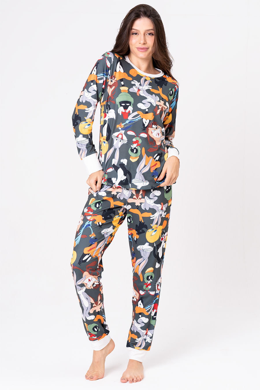 A nova coleção Looney Hollywood traz as nossas maiores estrelas de volta! A turma da diversão retorna em uma estampa moderna, que faz referência aos icônicos camuflados, mas com um toque vibrante e cheio de personalidade. Cada personagem reflete sua essência única, permitindo que todos se identifiquem com um ou mais deles. Quando o assunto é diversão e felicidade, os Looney Tunes são, sem dúvida, as verdadeiras estrelas! Pijama longo com a estampa exclusiva da coleção. Blusa com mangas longas e decote redondo. Calça com elástico na cintura e gorgurão para melhor ajuste na cintura. Combine com toda a família com os outros pijamas da coleção! Licenciado oficial Warner Bros.