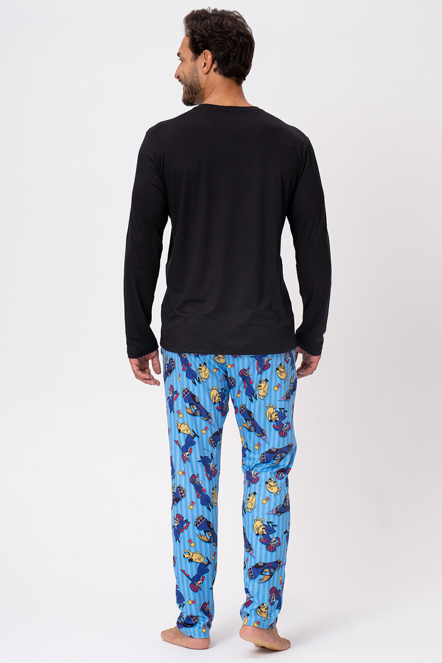 Ela, puro charme com um toque de rebeldia. Ele, o vilão mais atrapalhado das corridas malucas. Juntos, eles inspiram uma coleção que mistura nostalgia, estilo retrô e muito bom humor. Entre corridas, armadilhas e muito rosa, essa dupla icônica dos desenhos animados agora invade a Acuo com estampas exclusivas, cores vibrantes e referências pop que todo mundo ama. Blusa de mangas longas na cor preta com gola redonda e silk localizada na parte superior esquerda. Calça possui estampa exclusiva da coleção com elástico no cós e bolsos laterais. Combine com toda a família com os outros pijamas da coleção!