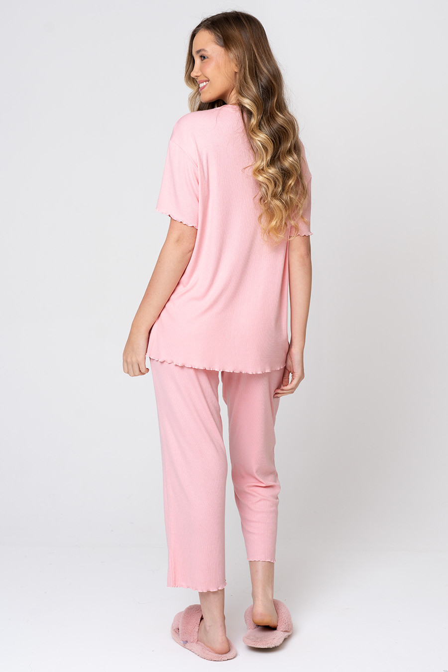 Este conjunto, confeccionado em ribana de viscose, oferece toque suave, elasticidade confortável e excelente respirabilidade, proporcionando bem-estar ao longo de todo o uso. A blusa de mangas curtas, com acabamento ondulado nas barras, traz um charme sutil e um caimento leve que acompanha o movimento do corpo. A calça, também com detalhes ondulados, possui cós elástico, garantindo ajuste confortável e liberdade para relaxar.