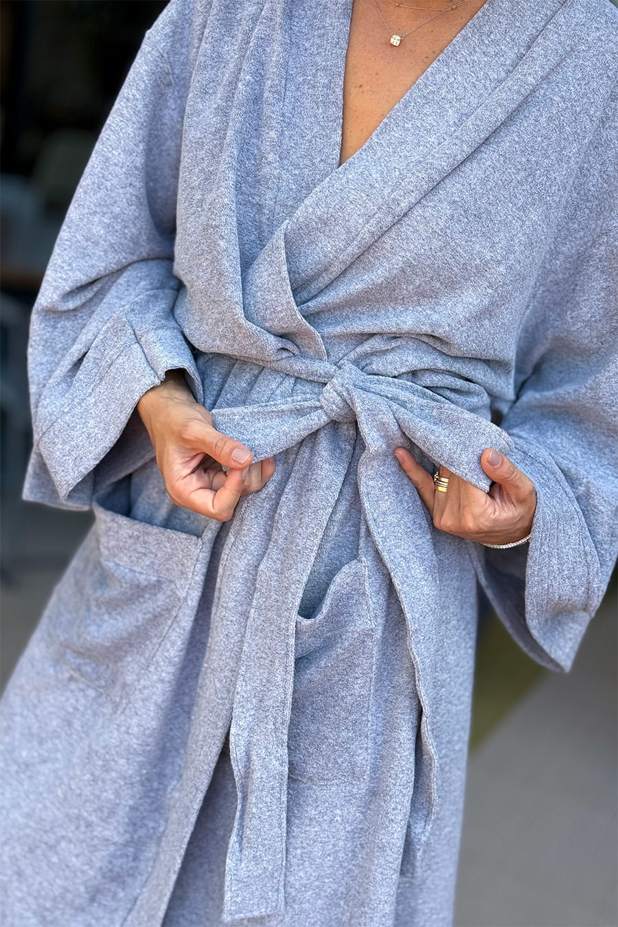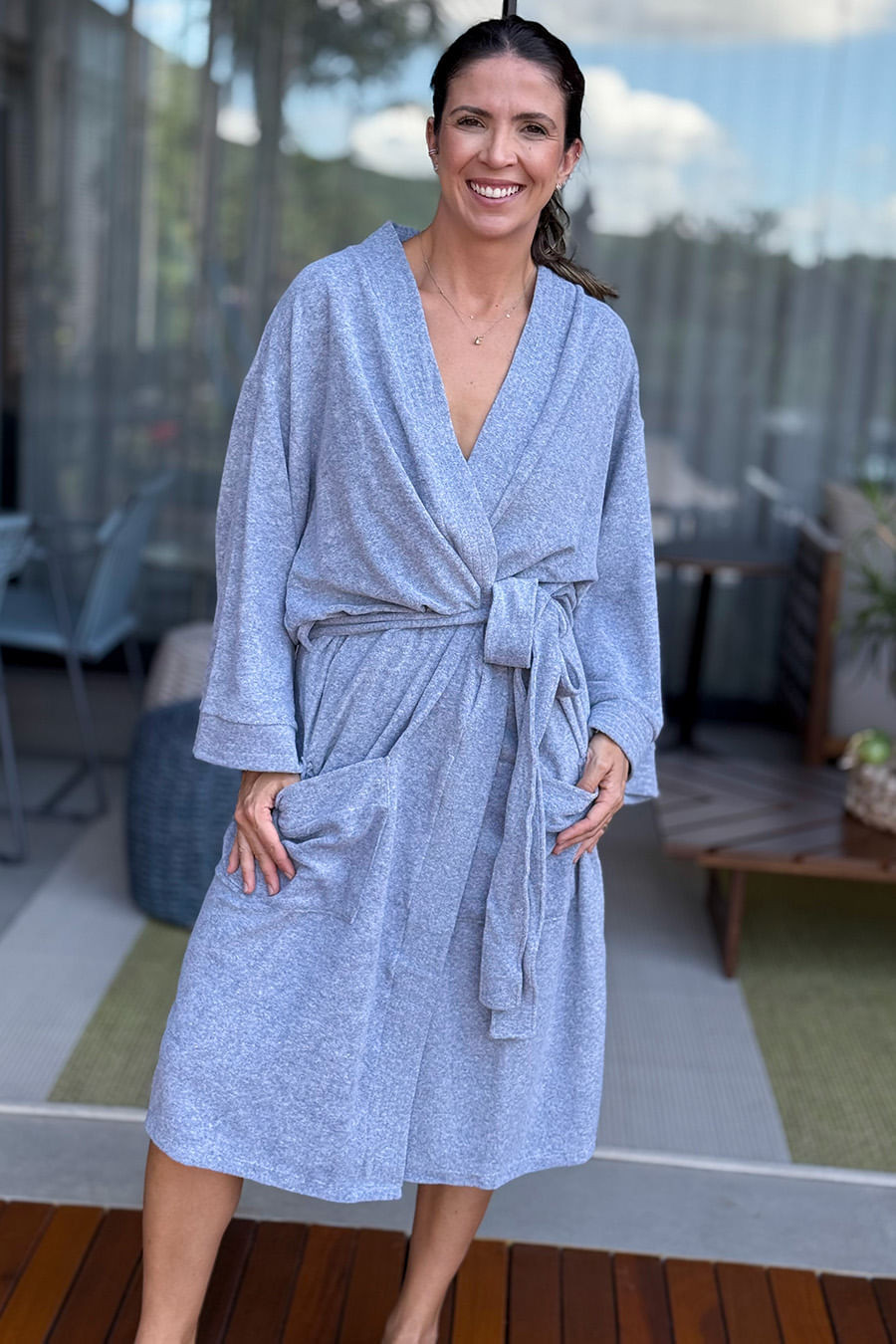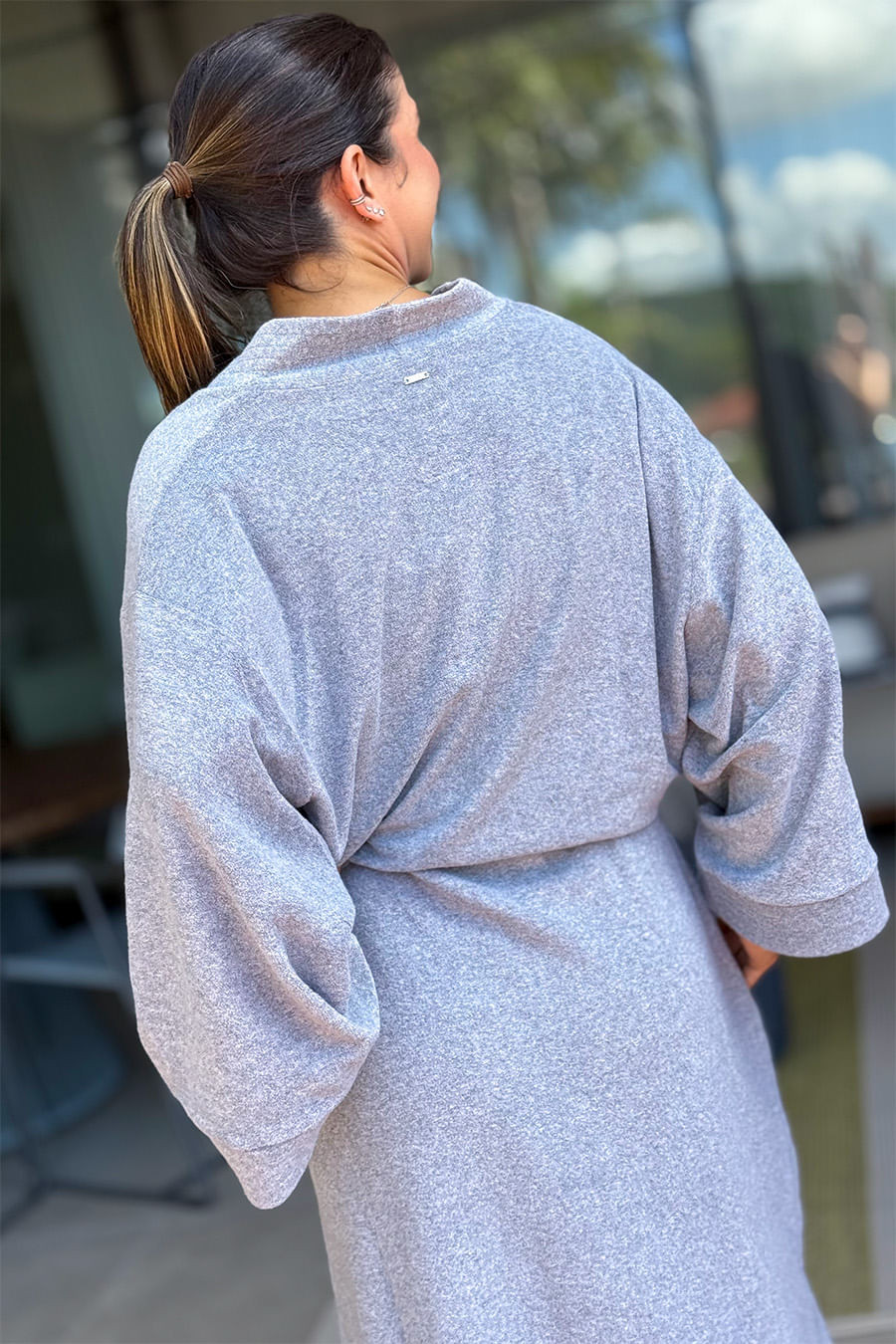 Peça atoalhada, possui bolsos laterais, amarração na cintura e mangas amplas, modelagem soltinha no corpo