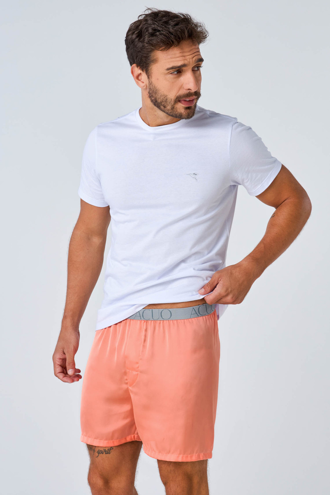 Samba canção confeccionada em tecido acetinado ou toque de seda, super leve e brilhoso. Conta com elástico amplo e escrita Acuo no cós. Perfeito para combinar com sua namorada ou esposa com outros pijamas da coleção.