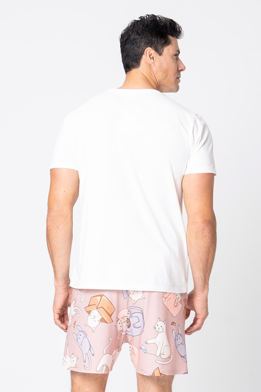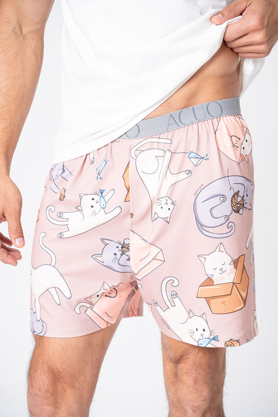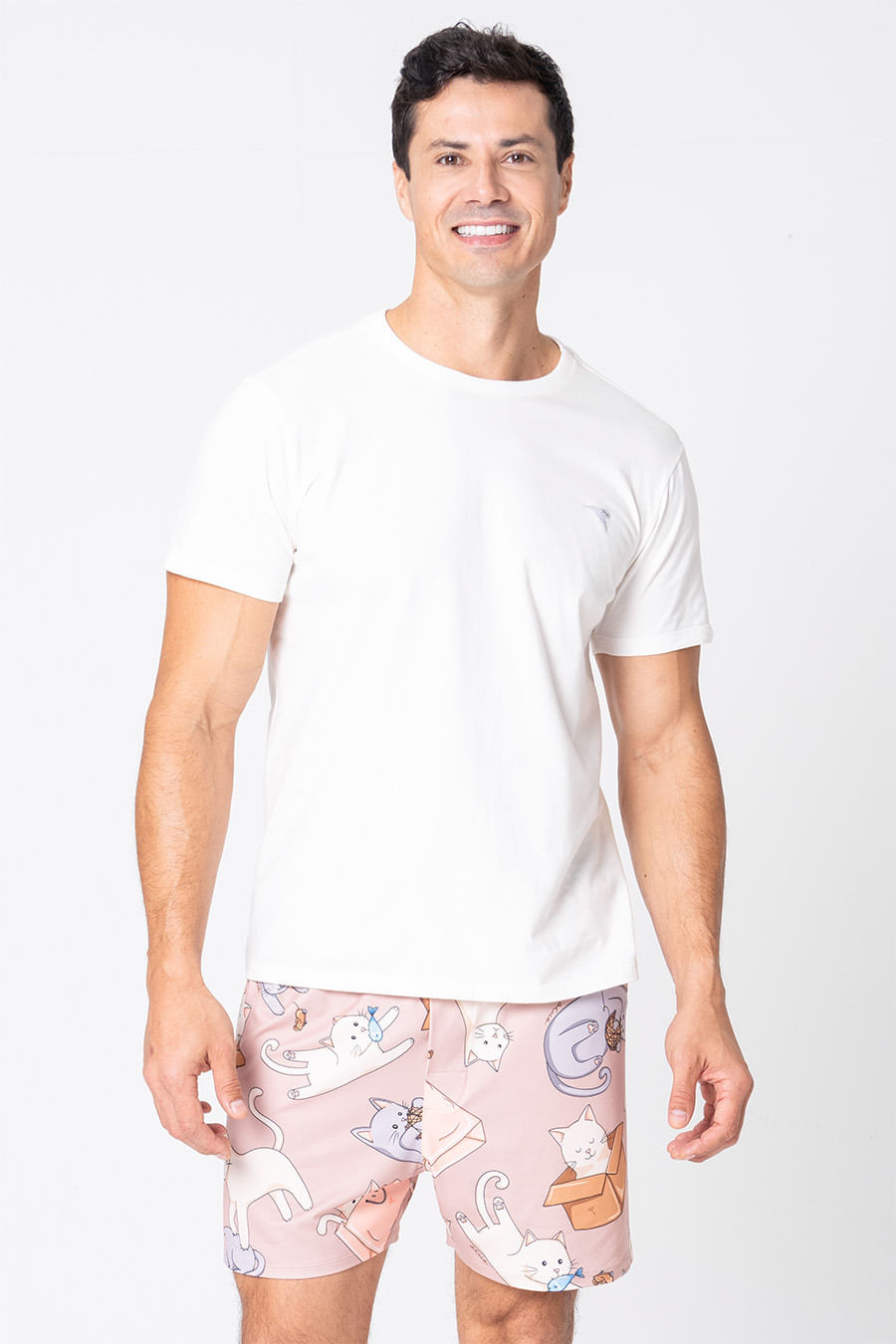 A coleção Gatices traduz toda a alegria e leveza de conviver com pets bagunceiros em casa. A coleção celebra as nossas alegrias do dia a dia com os gatinhos: momentos espontâneos de diversão e travessura, como se esconder em caixas, derrubar copos ou amassar pãozinho. Samba canção confeccionada em tecido macio e confortável que se adapta bem ao corpo. É um tecido resistente e durável, que não encolhe nem desbota facilmente. Fácil de lavar e secar, e mantém sua forma mesmo após várias lavagens. Conta com a estampa exclusiva da coleção além de elástico amplo e escrita Acuo no cós. Use a Camiseta de Algodão Eterno Masculino para complementar.